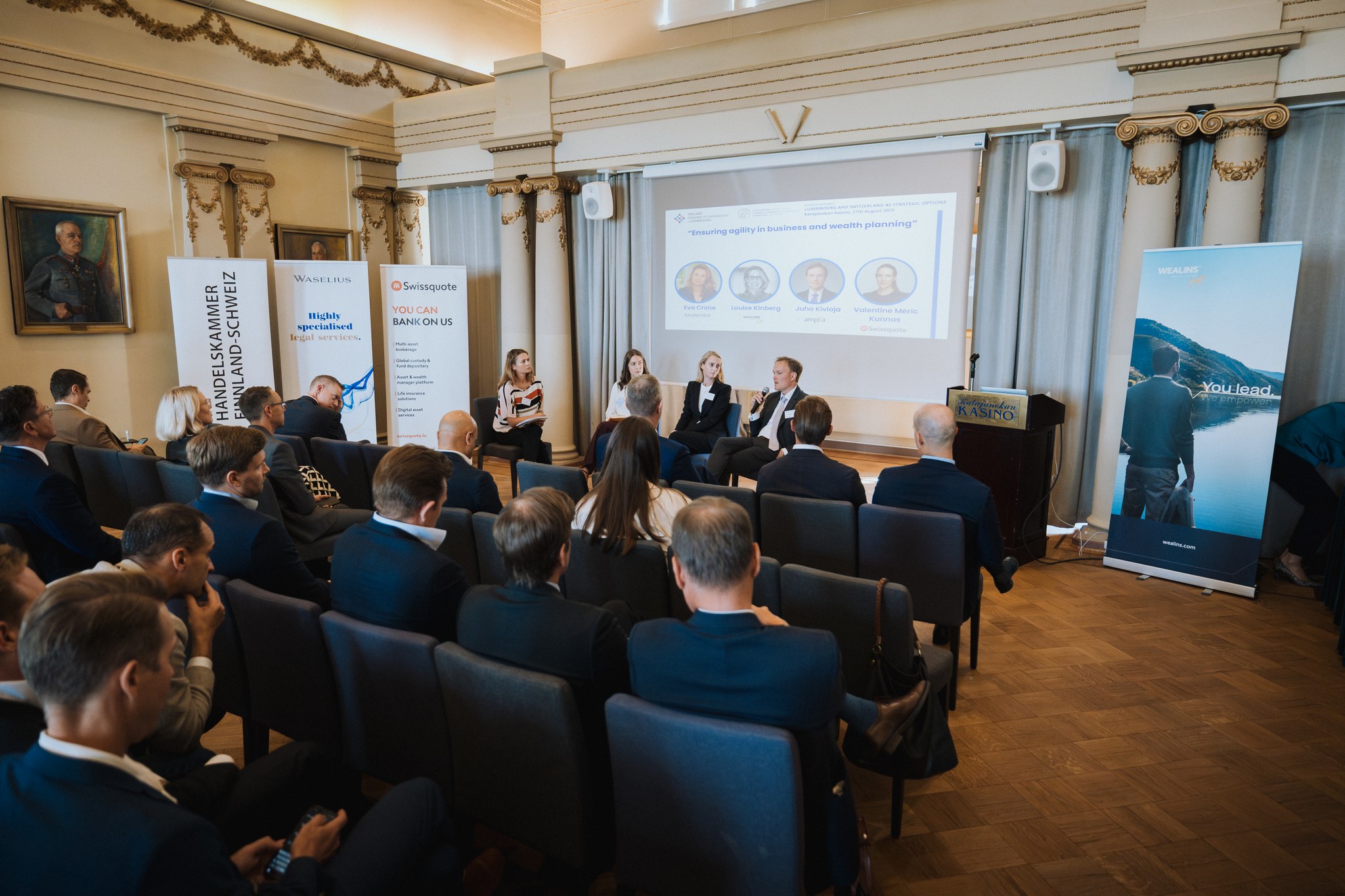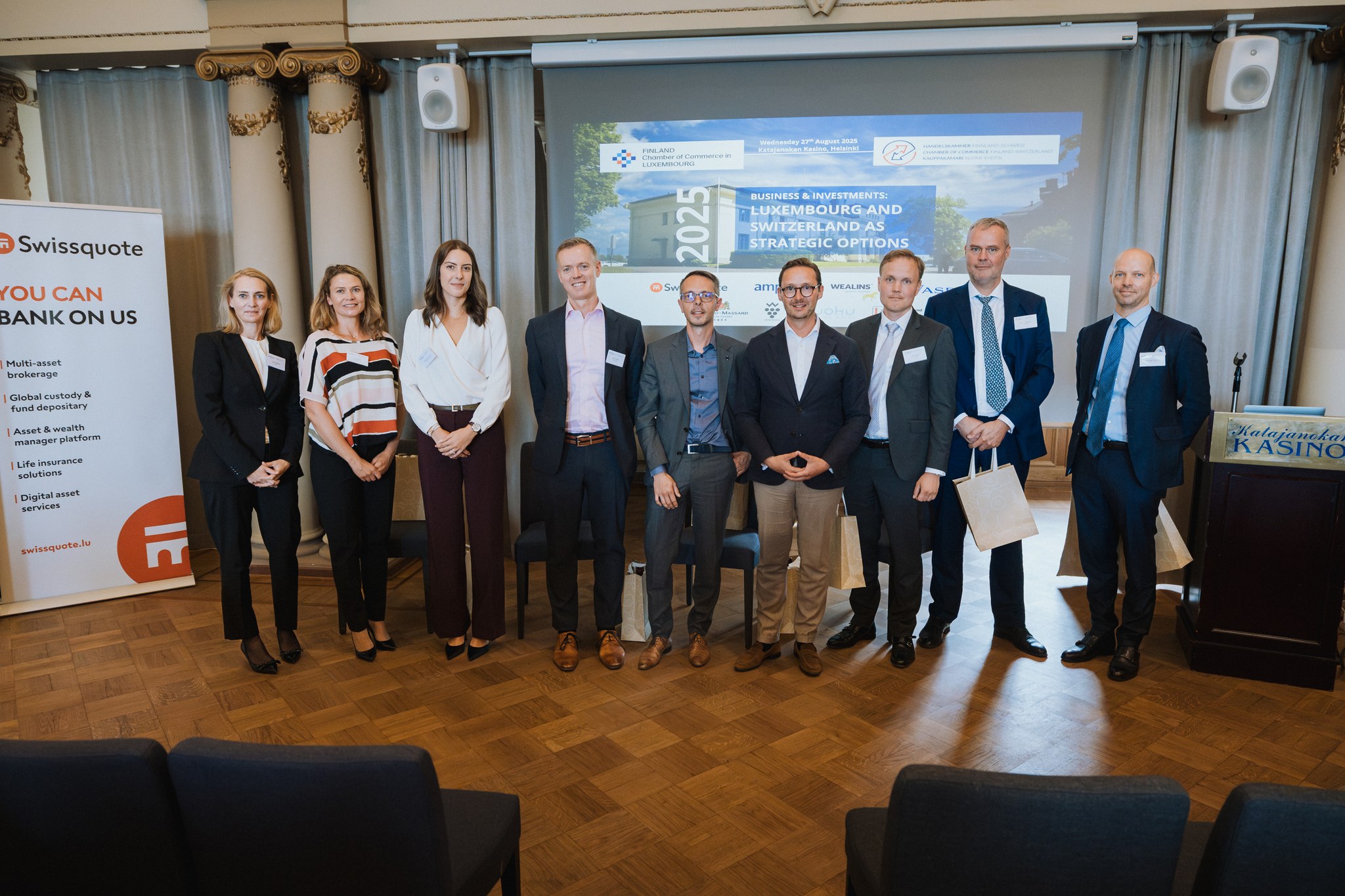 Meidät kutsuttiin dokumentoimaan FinChamLuxin ja Handelskammer Finnland–Schweizin yhteinen finanssialan tilaisuus Katajanokan Kasinolla Helsingissä. Tavoitteena oli tuottaa laaja kuvakokonaisuus sekä ytimekäs sosiaalisen median sisältökokonaisuus, joka palvelee sekä tapahtuman uutisointia että tulevien tilaisuuksien markkinointia. Myös puhujat pääsivät hyödyntämään kuvamateriaalia omissa LinkedIn‑julkaisuissa.